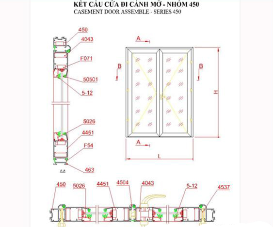 Cửa đi 2 cánh mở quay nhôm kính Việt Pháp hệ 4500